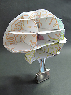 まずは、収斂進化モデルの構造をヒントにされたっていう、「脳アトラス」。切れ込みの入ったカードを組み合わせることで、脳の全体像が完成します。向かって右側は垂直方向の断面、左側が水平方向の断面ですね。大脳の機能領域は、それぞれ色分けされています。クリップを使って立たせるアイデアが面白いなぁ。サイトの方には、各感覚野や運動野の働きを、実際の器官と対応させた「ペンフィールドの小人」付きバージョンもアップされています。生徒達にはこちらの方が受けそうです。 |
