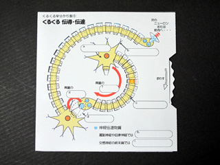 | そしてこちらが、今年度の「めぐる生命誌」を参考に作られたという、「神経の伝導伝達カード」です。右のダイヤルを回すと、内側のニューロンを電気パルス列が伝導し、シナプスに達した所で神経伝達物質を介して隣のニューロンに興奮が伝達されます。そして隣のニューロンでは新たに活動電位が発生し・・・・、ダイヤルの1回転を、内側のニューロンとシナプスと外側のニューロンに三分割し、ぐるり360度を見事に活用した見事な作品です。う〜ん、これはBRHで思いついても良かったなぁ。少し悔しいです。 | ||