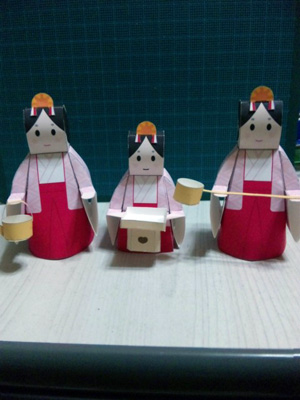 まずはキリンビバレッジのおひなさま。掲示板でも書いてらしたから言っちゃうと、嫁入り前のうら若きお嬢さんであるところのh.t.さん、桃の節句を過ぎてもひなかざりを仕舞わずに飾っておくと云々っていう縁起でもない俗説がありますが、飾るどころか組み立てるのも間に合わず、結局この5体だけ作って後は来年に回したそうです。大丈夫大丈夫、来年来年。