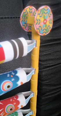 この作品を作るに至ったきっかけは、昨年の5月に鯉のぼりを作っていつものように近所の幼稚園で展示したところ、園児たちから「これは動かないの〜?」と言われたことだそうです。それまで声をあげたりスイッチを入れると動き出す作品を何体も展示していた訳ですから、素直な声だったのかもしれませんが、子供って残酷なもんですね。そこで今年は一工夫して、まずは竿が左右に動く鯉のぼりを作って持って行ったところ、今度は園長先生から「これは本物とは違って竿も動くのですね。」とクールな一言。おいくつの方かは知りませんが、なかなかに大人げない園長先生です。なにくそそれなら!ということで、竿は動かず鯉のぼりだけが揺れ動くように工夫に工夫を重ねてたどり着いたのが、今回送っていただいた作品。竿が二重になっていて、中の軸だけが左右に動くようになっているしかけ、下の写真で見ていただけますかね。鯉のぼり自体の重量もあり、バランスを取るのにずいぶん苦労されたんじゃないかと思いますが、端午の節句に間に合って良かったです。今年こそは生意気な園児たちを黙らせてやってください!(2015.4.1)