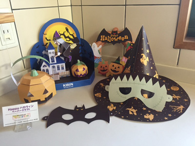 「お月見セット」と「ハロウィン」の2点。プレートを作ってちゃんとキリンビバレッジのサイトの紹介をしていただいてるところがありがたいです。商品の売り上げには直接関係のないペーパークラフトコーナーをこんなに長年続けていられるのは、一重にキリンのサイトを訪れてダウンロードしてくれる大勢の方々のおかげです(皆さんが想像されている数より多いです、きっと。僕も時々聞いてびっくりしてます。)。作る作らない・好き嫌いはともかく、新作が出たらまずはダウンロード、昔落としたデータはどこだろうってハードディスクの中を探し回る暇があったら迷わずダウンロードってことで、引き続きよろしくお願いします。