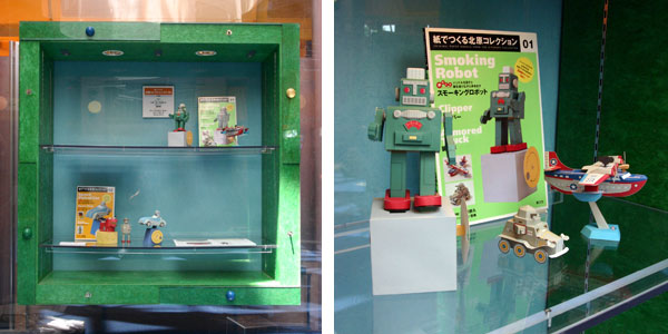 変わってここからギャラリースペース。こちらはからくりモノとキャ ラクターモノで統一しました。まずは市販キットのからくりペーパーク ラフトを12点。中央のテーブルには回して遊べる展示品を10点くらい置いてきましたが、たぶん最初の3日で壊れていることだろうと思います。