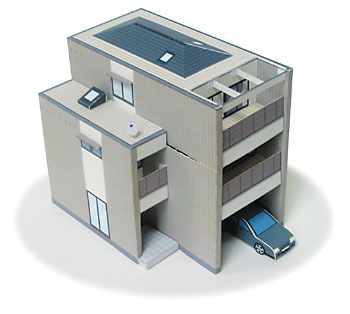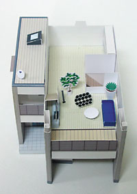 このモデルのミソは、3階部分を自由に取り外して、附属のインテリアパーツ(こちらもタイアップ。イタリアンモダンとミッドセンチュリーモダンの2タイプから選べます。)を使って2階のリビングスペースのいろいろなレイアウトを試せることです。インテリアのスケールももちろん100分の1、ソファやテーブルはともかくとして、幅10センチのPiegaのスタンドスピーカーなんかは幅1ミリですから、この辺は洒落ということで笑って許してください。自動車も、オペルの新車が2台付いてきます。これもタイアップですね。家建てたばっかりで何も車2台も持たなくてもいいのにと、締め切り間際にはこの設定を少し恨めしく思いました。屋上にはスカパーのアンテナもついています。しつこいですがこれもタイアップです。 |