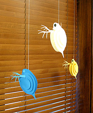 という3つのポイントを、楽しく簡単に組み立てられるペーパークラフトを通じて小学生に伝えたいというご依頼。けっこう悩みましたが、監修の先生方のアドバイスもいただきながら、何とか条件をクリアできたのではないかと思っています。言われたまんま作ったんじゃ悔しいので、授業で作った後に壊さずに持って帰れるように、折りたたみ式のしかけも加えました。色画用紙で作って頭の穴に糸を通せば、風にそよぐ甲殻類鰓脚綱枝角目、お洒落なミジンコモビールの出来あがり、縮小して作れば手乗りミジンコだってできてしまいます。ミジンコに興味のある人もない人も、小学生のお子さんがいる人もそうでない人も、是非じゃんじゃんダウンロードして組み立ててみてください。