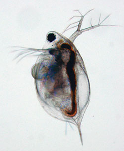 これが教科書などでよく見るミジンコですよね。コイツが三次元的にどんな形してるのかなんて、全然気にしたことなかったのですが、実はけっこう意外な形をしてるんです。まずはそのフォルム。顕微鏡写真で見慣れているミジンコは、たまたまレンズの前でうまい具合に真横を向いてくれたミジンコの姿で、正面や後ろから見ると、かなり丸っこい形をしています。肩のあたりからは、二股に分かれた腕・・・と思いきや実は触角が左右に伸びていて、この触角をヒョコヒョコ動かして、水中を移動するんだそうです。そして僕が一番びっくりしたのは、成長したミジンコでは目が真ん中に1個しかないという衝撃の事実。体が透明だから、左右どっちから見ても黒くて丸い目が見えてしまうんだそうですよ。これは本当に知らなかった。