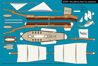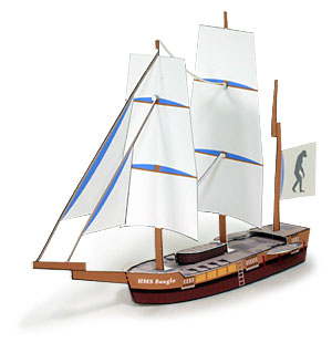 毎年ネタ探しに困るペーパークラフト年賀状、今年はちょっと調べただけでも、「ガリレオの天体観測400周年」や 「アポロ月着陸40周年」など科学がらみの面白いトピックが沢山あって、珍しくどれにしようか迷ってしまいました。でもまぁ、季刊 生命誌に長年たずさわっている僕としては、やっぱりコレを作っとかないとバチが当たるでしょう。 「ダーウィン生誕200周年」と「『種の起源』出版 150周年」記念を兼ねて、イギリス海軍の測量船『ビーグル号』です。ダーウィンは30代の前半に4年間をかけてこの船で世界を一周し、その時の体験が後に『種の起源』を執筆するきっかけとなりました。従来の進化論に自然選択という考え方を持ち込んだダーウィンのこのアイデア、日本ではわりとすんなりと認められているようですが、キリスト教圏(特にアメリカ)では現在に至るまで様々な論争を巻き起こしています。科学的な正しさや論理だけでは人は納得しないのだなぁとつくづく感じてしまう、端から見てる分にはとても楽しめる話題がいっぱいあるので、興味のある方は調べてみてください。