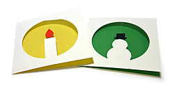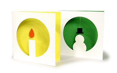 クリスマスカードは、たぶん今まで作った中でも一番簡単な立体カードです。二つ折りのカードをちょっと開いて息を吹きかけると、糸を通したオーナメントがクルクルと回ります。サイトからダウンロードできる型紙は「ろうそくバージョン」だけですが、原理は一目瞭然ですよね。是非自分だけのモチーフを考えて、クルクル回してあげてください・・・来年・・・ああマヌケだ・・・。