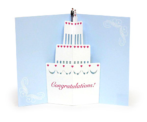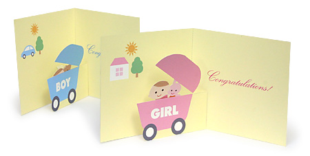 昨年に引き続き、今年もお声をかけていただいて、手軽に作れる簡単ポップアップカードを2種類作りました。今回は、機会があれば季節を問わず使える「出産祝いカード」と「結婚祝いカード」の2種類です。日本中の老若男女を対象に「分かりやすくて作るのも簡単」っていうお題の中で、どれだけらしさを出せるかってのが自分の中での隠しテーマだったりしたのですが、「出産祝いカード」の方はなかなか良くできたのではないかと自分では思ってます。最近ようやくマスターしつつあるポップアップの「V字折り」を使って、カードを開く力でベビーカーのフタが開き、中から赤ちゃんがコンニチハするしかけは、実際に組み立ててみると、思ってる以上にシンプルな部品で出来ていることに気づいていただけるんじゃないかと。とっても応用が利くしかけなので、これを変形させてあと何点か作れそうです。
