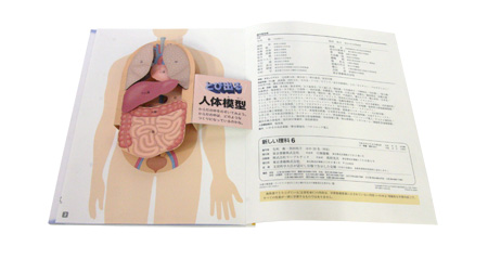 裏表紙をめくると、巻末に綴じ込まれた2つ折りの厚紙がペロリと現れます。今回のお題は、B5サイズよりやや大きいこの紙2枚を使って、ポップアップタイプの人体模型を作れというものでした。右側が人体の台紙、左側が心臓や肺などの主要器官のパーツです。