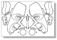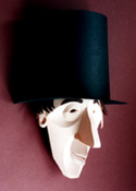 ところで、この作品が、紙彫刻ではなく、キットのコーナーに展示されているのは、別に間違えたわけではありません。この作品は、もともとキット化を前提として制作したものです。あらかじめ、機械によって型抜きと筋押し加工をほどこしておけば、誰でも簡単にアンデルセンを組み立ててお部屋に飾ることができます。こんなおじさん飾りたくないですか、ああそうですか。まぁ、技術見本だと考えてください。右上に揚げた一枚の紙に、帽子を除いたすべての部品が収まっています。 |