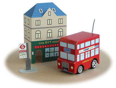 トミカ、プラレールに続くトミーの看板商品、コンパクトサイズのラジコン、トミカ・ビットチャージーにペーパークラフトのおまけがつきました。抜き・折り済みの型紙をペリペリとはずして、のりでちょいちょいとくっつけるだけで、ロンドンバスとティールーム、おまけにバス停の3点セットができあがります。バスの前後にあいた穴をビットチャージー本体の突起にはめ込めば、インプレッサWRXやホンダS2000と紙の2階建てバスの、現実感とスケール感を完全に無視した夢のレースが可能になります。4月7日に池袋サンシャイン噴水広場で開催されるイベントを皮切りに、全国の有名おもちゃショップ(一部を除く)でビットチャージーをお買いあげいただいたみなさんに配布される予定です。 たいへん楽しい仕事でした。ノリノリでやりました。評判良いといいなぁ。連作でやりたいなぁ。「動くとちょっとヤなもの」シリーズやりたいなぁ。 |