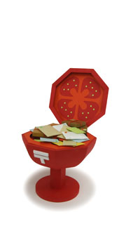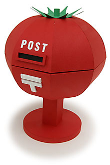 お次はトマトのポスト。視聴者から寄せられた質問や疑問に番組が答えるコーナーで使われます。紙彫刻のカテゴリーに載っている他の作品同様、このポストも、表面だけを見てると紙だけでできているように見えますが、内部ではあの手この手を使って構造を支えています。本当はハンドルを回すとカパッとふたが開くしかけにしたかったのですが、構造と強度の都合で断念しました。カメラには写らない所に控えたADさんに、キューにあわせて釣り糸をエイヤッと引っ張ってもらうという強引なしかけでお送りします。お願いだから引っ張りすぎて壊さないでくださいね。同じものはもう2度と作れないかもしれません。 | |||||