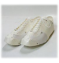 先日バックアップディスクを整理していたら、以前のハードディスクのクラッシュでこの世から消えたと思っていた、2年前のお仕事の完成画像を発見しました。せっかくなので更新します。白いものは撮影が難しく、写真がイマイチでごめんなさい。 渋谷区一の紙好きを自認するぼくも初耳だったのですが、合成皮革に自然な革の質感を出すために、各種の質感をもった特殊な紙をギュッとプレスして使用する加工法があるそうです。その特殊紙を製造するメーカーが、シューズデザイナーと組んで海外で展覧会を催した際に、ディスプレイ用の紙の靴の制作を依頼されました。写真ではよ分かりませんが、2足ともその特殊紙でできています。 シューズデザイナーさんが実際にデザインした靴がモデルであるため、完成品とともにその靴の型紙を貸し出してもらいました。考えてみたら当たり前なんだけど、もともとは平面である革から立体の靴を作る過程は、驚くほど紙工作にそっくり。のりしろにあたる部分なんかもちゃんとあって、型紙の通りに紙を切ってのりづけしていけば、すぐにでも靴模型ができあがりそうな勢いでした。ところがやっぱり違うのが柔軟性。革であれば伸ばせば足の形にフィットするところが、紙ではやはり無理があって、所々に切り込みを入れて丸みを再現しました。いやしかし写真で見てると実際履けそうですよね。よくできてんなー。久しぶりに見直した作品だから自分でもびっくりしてたりして。 |